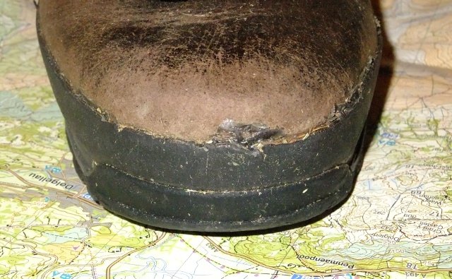 So far i’ve used it to glue an entire heel back together (it had separated into 3 layers!) and then back onto the shoe, and that’s held for a fair few months. It’s also been invaluable in sticking back the rubber rand around my boots. My last pair went at the rand, it peeled off and water kept getting in. Shoe Goo meant that I’ve been able to stick the rand back down and keep the boots waterproof. The repair shown below has lasted a good few months and took only minutes to do.